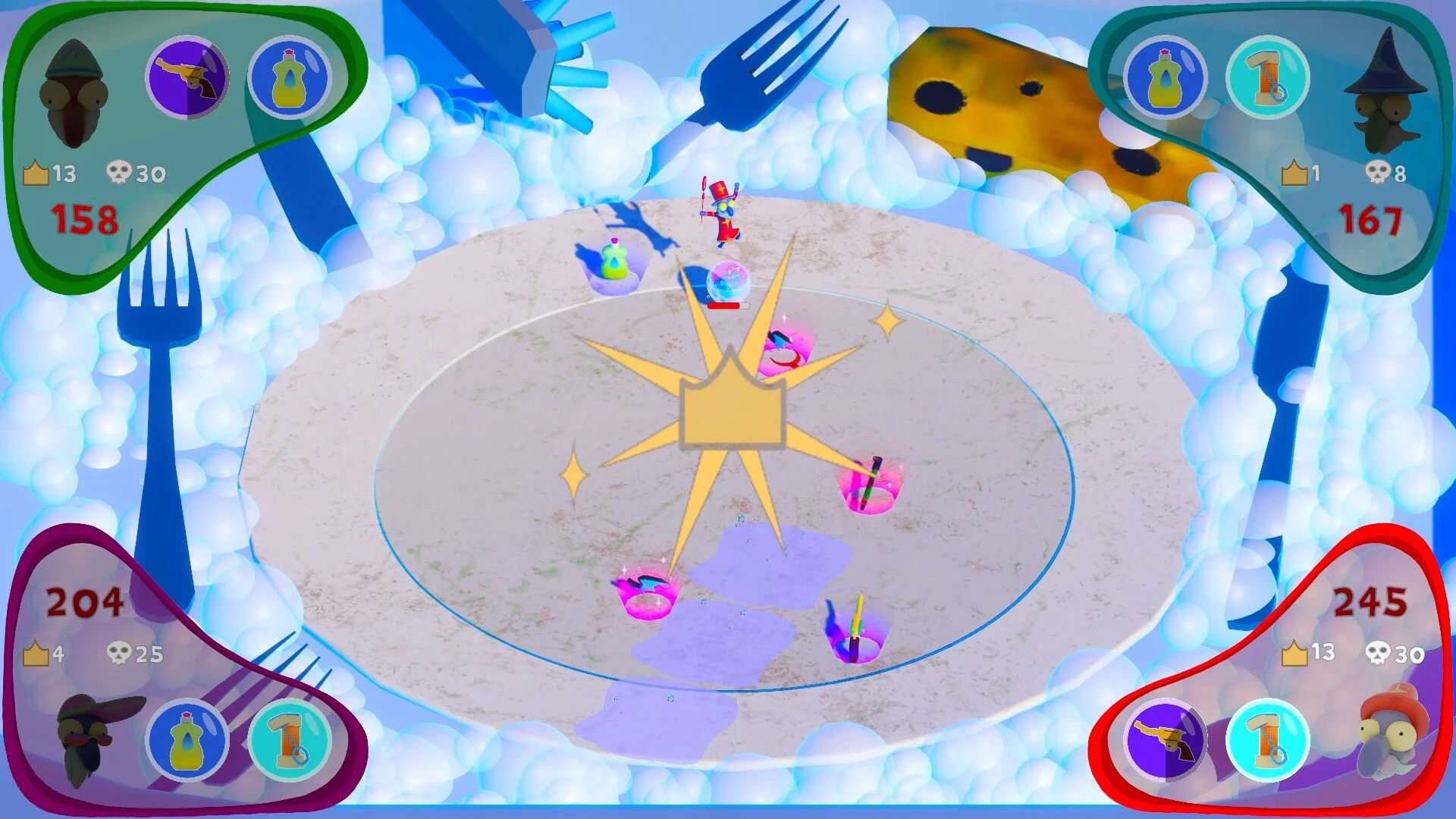 Wizzo Popout is a fast-paced, 3D top-down arena shooter for up to 4 players. Play as an arcane wizzo riding a bouncing magic bubble!